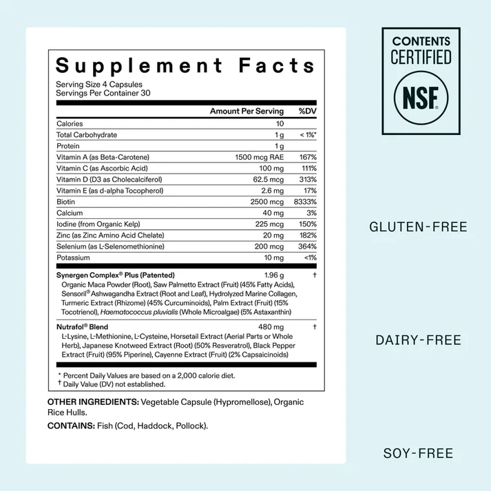 A multi-pathway blend including botanicals that support hormone balance and stress response, plus marine collagen, biotin, antioxidants, and key micronutrients.